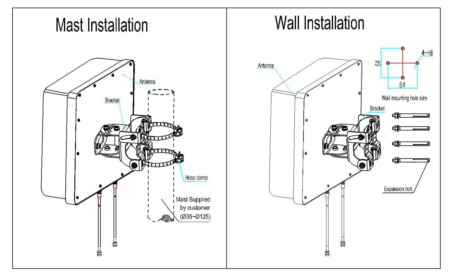 Die Panelantenne kann sowohl an eine Wand als auch an einen Mast befestigt werden. Den Anschluss ermöglicht ein 15 cm langes Kabel mit einer N-Buchse. Das Radom der Antenne ist aus einem ABS Kunststoff gefertigt.